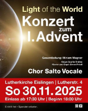 |  | Sonntag, den 30.11.2025 - 18:00 Uhr Light of the World- Konzert zum 1. Advent |  | Mittwoch, den 03.12.2025 - 19:00 Uhr Lesung mit Barbara Schmid- 'Die verborgene Gewalt gegen Frauen' Clubhaus des FC Eislingen Haldenstraße 73054 Eislingen