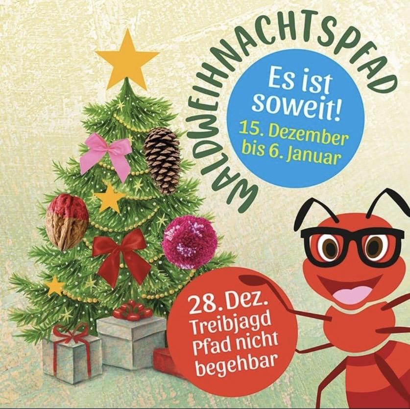 Die Organisatoren-innnen des Waldweihnachtspfads weisen darauf hin, dass am Samstag, den 28. Dezember 2024 eine Treibjagd im Bereich des Brentenholz-Parkplatzes und Umgebung angesetzt ist. Von einem Besuch, bzw. eines Trainigslaufs an diesem Tag sollte Abstand genommen werden. | ||||