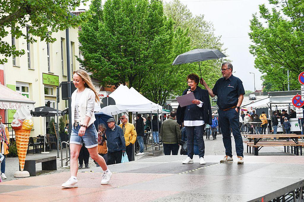 Auf der Aktionsbühne waren drei Modenschauen geplant. Die erste um 14 Uhr wurde von 'Mode & Kosmetik Canestrini' bestritten. Trotz leichten Regens präsentierte Inhaberin Elvira Canestrini ihre Kollektion, charmant moderiert – und beschirmt – von Oliver Marzian.