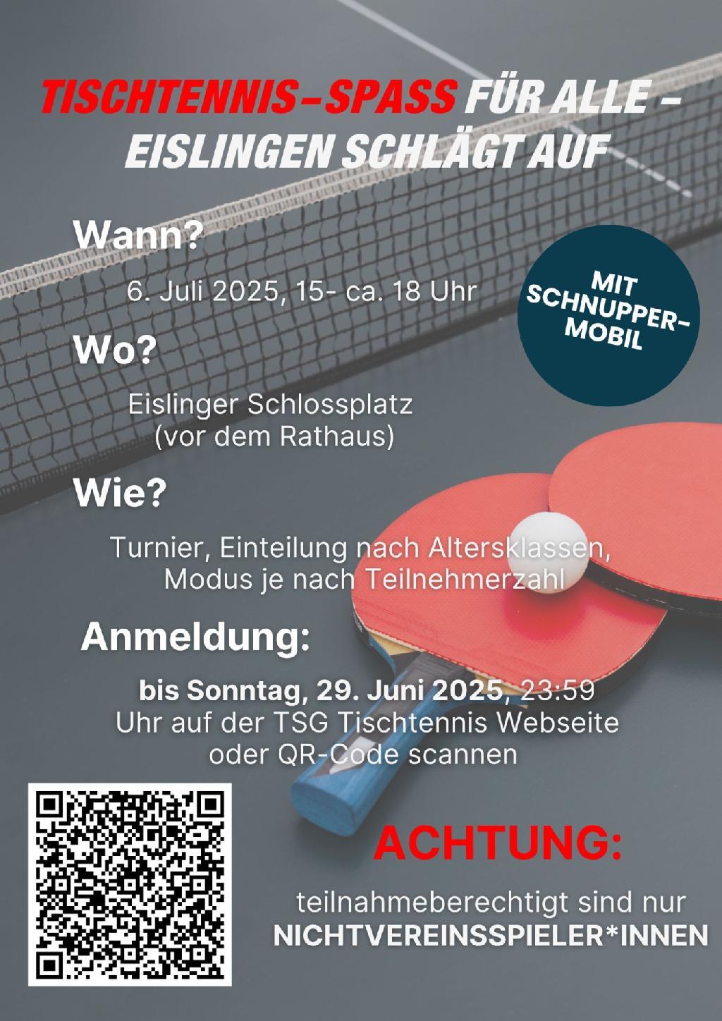 Im Rahmen des 24. Eislinger Stadtfestes findet am Sonntag, 06.07.2025, um 15.00 Uhr ein Tischtennis-Turnier auf dem Schlossplatz statt.