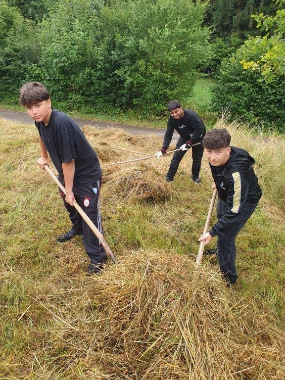 Auch in diesem Jahr erhielt der BUND Eislingen Hilfe bei der Pflege einer Blühwiese am Nordrand von Eislingen. Drei Schüler der Silcherschule Eislingen packten im Rahmen der Aktion 'Ehrensache' beim Abrechen und Abräumen des Heus dieses Biotops mit an. | ||||
