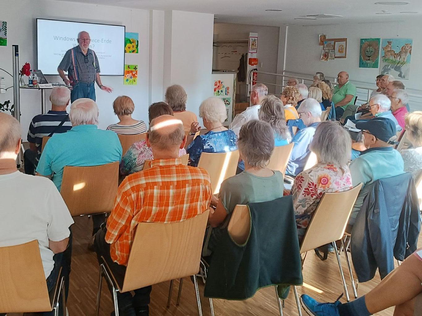 ![]() Der Vortrag war sehr gut besucht. Gespannt verfolgen die Zuhörerinnen und Zuhörer dem interessanten Vortrag rund um das Support Ende von Windows 10. | ||||