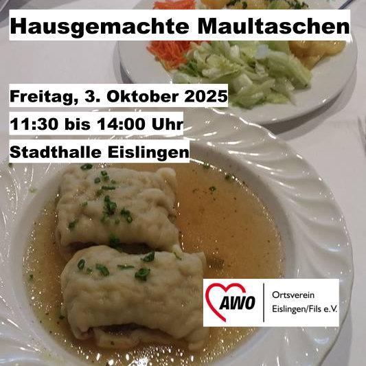 Die Arbeiterwohlfahrt (AWO) lädt am Freitag, 3. Oktober 2025, zum traditionellen Maultaschenessen in die Stadthalle Eislingen ein. Los geht’s ab 11:30 Uhr. Besucherinnen und Besucher dürfen sich auf frisch zubereitete Maultaschen – klassisch in der Brühe mit Kartoffelsalat - freuen. | ||||