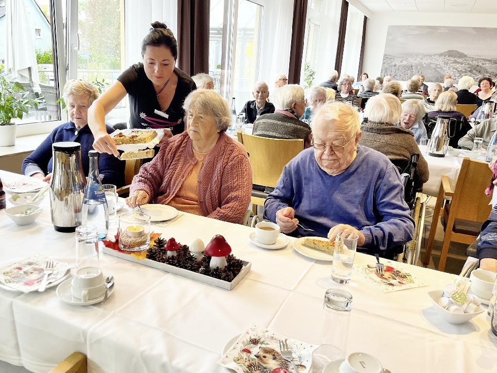 Am Montag, den 13. Oktober 2025, wurde im Altenzentrum St. Elisabeth in Eislingen der Herbst mit einem fröhlichen Fest gefeiert. Die Veranstaltung fand im gemütlich dekorierten Café St. Elisabeth statt und war ausschließlich für die Bewohnerinnen und Bewohner des Hauses gedacht. Schon beim Eintreten sorgten herbstliche Dekorationen und der Duft von frisch gebackenem Zwiebel- und Krautkuchen für eine einladende Atmosphäre. Das Küchenteam hatte sich besondere Mühe gegeben: Neben den deftigen Köstlichkeiten wurde auch ein süßer Topfenstrudel serviert – dazu passend ein Glas „neuer Wein“, der für viele ein echtes Stück Herbsttradition darstellt. | ||||