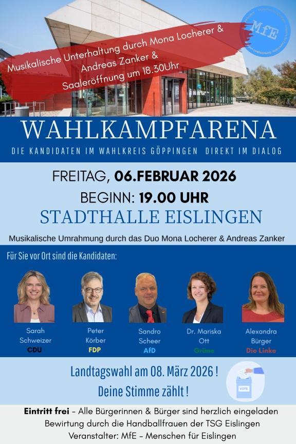 Am 6. Februar veranstalten die Menschen für Eislingen (MfE) e.V. eine Wahl-Arena zur Landtagswahl mit den Direktkandidaten von fünf Parteien. Es ist eine von nur wenigen öffentlichen Podiumsdiskussionen zur Wahl am 8. März. Mit dabei sind Sarah Schweizer (CDU), Sandro Scheer (AfD), Dr. Mariska Ott (Grüne), Peter Körber (F.D.P.) sowie Alexandra Bürger (Linke).