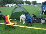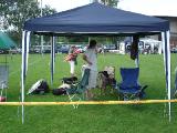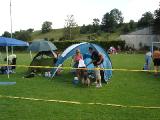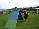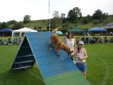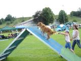 Hier ging es für die Hunde und dazugehörenden Frauchen und Herrchen um die regelgerechte Überwindung eines Parcours. So darf der Hund zum Beispiel nach Überwindung eines Hindernisses nicht sofort auf den Wiese hüpfen, sondern muss mit zwei Pfoten auf der Abstiegsfläche warten, bis er den Befehl zum weiterrennen bekommt.