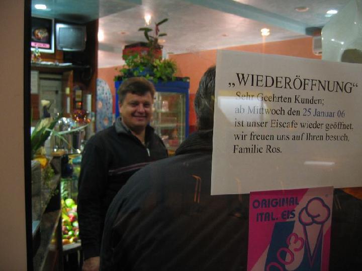 Waren es die eisigen Temperaturen, die den Öffnungstermin des Eiscafé Ros durcheinander gebracht haben? Das Fan-Publikum jedenfalls stand am Dienstagabend vor verschlossenen Türen. Heute abend geht es jetzt wirklich los, wie man dem Schild an der Tür entnehmen kann, Herr Ros lächelt schon und Davide bringt alles auf Hochglanz.