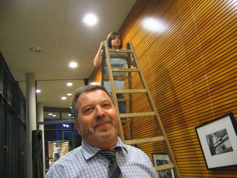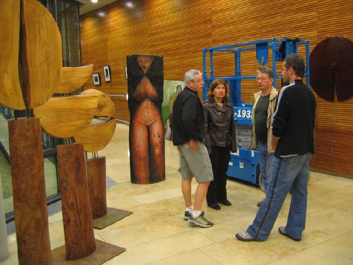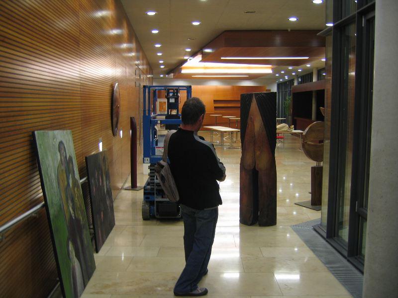 Nach einer anstrengenden Fahrt mit einem vollbepackten LKW von 8m Länge kamen die Künstlerinnen und Künstler aus der Eislinger Partnerstadt Oyonnax am Donnerstagabend an der Stadthalle an und begannen sofort, ihre Werke auszupacken. Rasch wurden die Foyers der Stadthalle mit Skulpturen und Gemälden bestückt und nach fast getaner Arbeit wurde das 'Waldhorn' aufgesucht, um echt schwäbische Kost zu versuchen: Kartoffelschnitz und Spätzle oder vornehm ausgedrückt: Gaisburger Marsch. Damit und mit Hefeweizen gestärkt konnte dann eine Lichtprobe in der späten Abendstunden durchgeführt werden - die Lichtverhältnisse waren zwar nicht optimal, aber doch akzeptabel. Morgen wird weiter aufgebaut und um 20 Uhr gibt's dann die Vernissage. Freuen Sie sich schon auf eine sehr abwechslungsreiche Ausstellung!