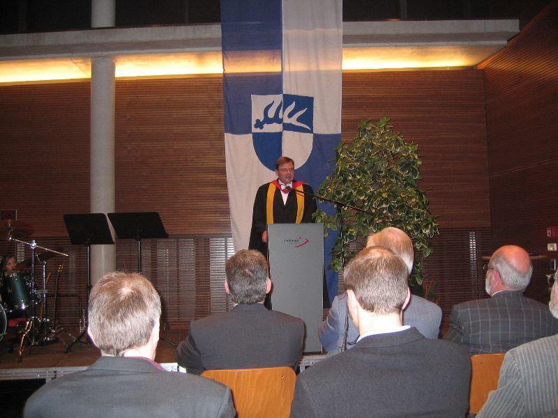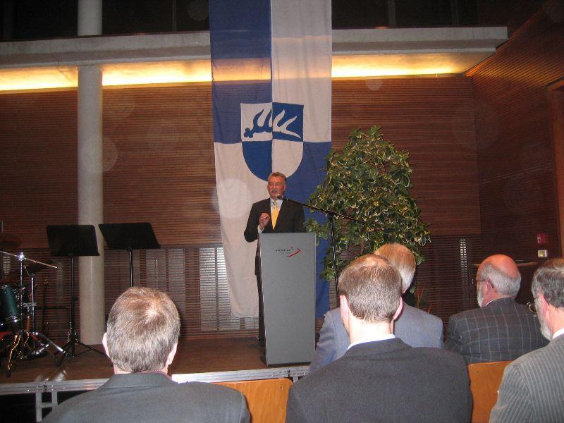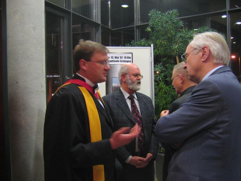 Bürgermeister Günther Frank dankte nochmals allen, begrüßte den ersten Träger der Ehrenplakette Rainer Weiler, den langjährigen Stadtarchivar mit seiner Gattin, und zeichnete Dr Reinhard Rademacher und Philipe Havlik für ihre 'hervorragende Verdienste bei der Ausgrabung, Bergung und Präsentation der Eislinger Fischsaurierfunde' mit der Eislinger Ehrenplakette aus. In einer unterhaltsamen Laudatio ehrte Prof Michael Montenari von der University of Newcastle ('to carry pottery to Newcastle' sei wie 'Eulen nach Athen' oder 'Saurier nach Eislingen' tragen) die beiden Kollegen, insbesondere weil sie es verstanden haben, hochkomplexe wissenschaftliche Zusammenhänge der Bürgerschaft verständlich zu machen.