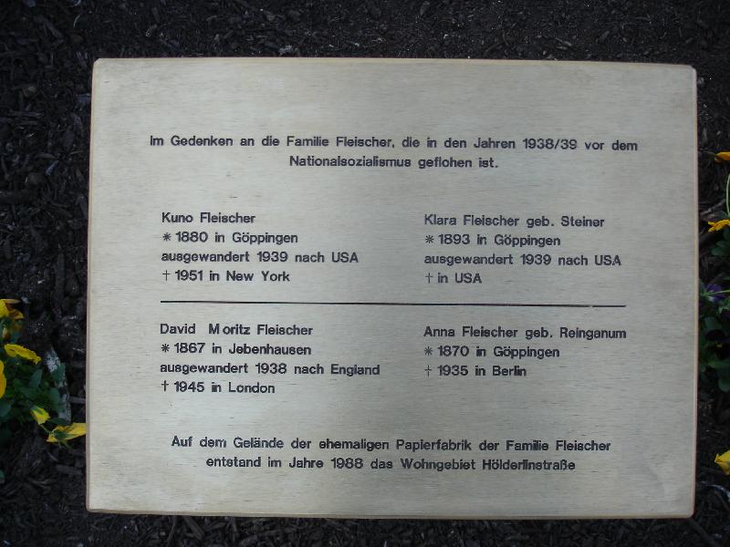 Ob es nun den Anstoß des Projekts 'Stolpersteine' des Kölner Bildhauers Gunter Demnig bedurfte oder nicht, Eislingen gedenkt der Unternehmersfamilie Fleischer, die 1938 als Juden ihre florierende Papierfabrik in Eislingen zwangsweise abgeben mußten. Sie flohen vor den Greueltaten des Nationalsozialismus nach England.