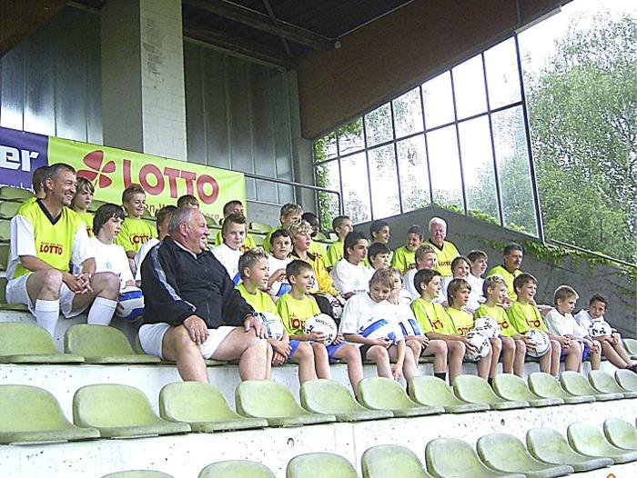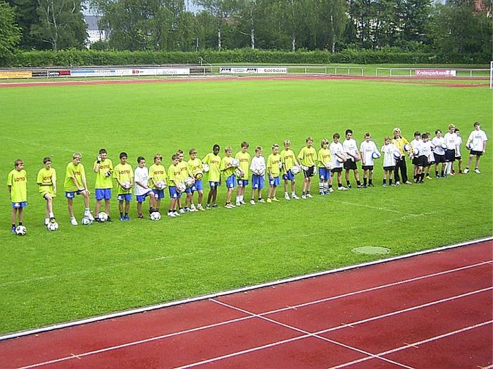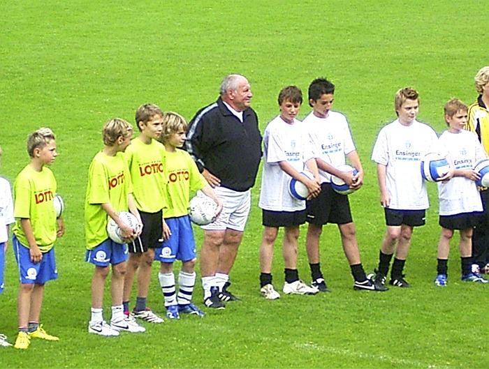 Letzten Samstag konnten 30 Jungs aus Eislingen und Heiningen über 90 Minuten mit namhaften Altstars im Eislinger Eichenbach-Stadion trainieren. Organisator Jürgen Burger konnte für das Event, gesponsert von Toto-Lotto Baden-Württemberg und Ensinger Sprudel, Karl Allgöwer, Helmut Haller,Buffy Ettmayer und Giacomo Belardi gewinnen. Vor dem Trainingsbeginn wurde der Nachwuchs mit Trikots der Sponsoren ausgestattet. Pünktlich um 13.30 Uhr konnte der Moderator Oliver Roth die Nachwuchstalente und Promis begrüßen. Bürgermeister Frank von der Stadt Eislingen begrüßte die Teilnehmer recht herzlich. Der an diesem Tag glänzend aufgelegte Buffy Ettmayer, stellte den Zuschauern und dem Fußballnachwuchs vor allem Karl Allgöwer und Helmut Haller kurz vor. Beim VFB Stuttgart hat Karl Allgöwer in seiner Karriere 129 Tore geschossen, was von keinem anderen Profi bisher übertroffen wurde. Helmut Haller hatte an 3 Weltmeisterschaften teilgenommen und wurde als einziger Profi aus dem Ausland in Italien zum Spieler des Jahres gewählt.