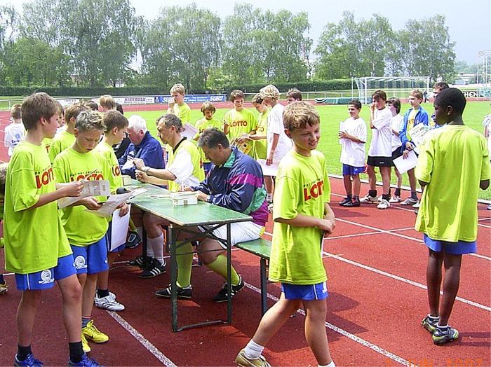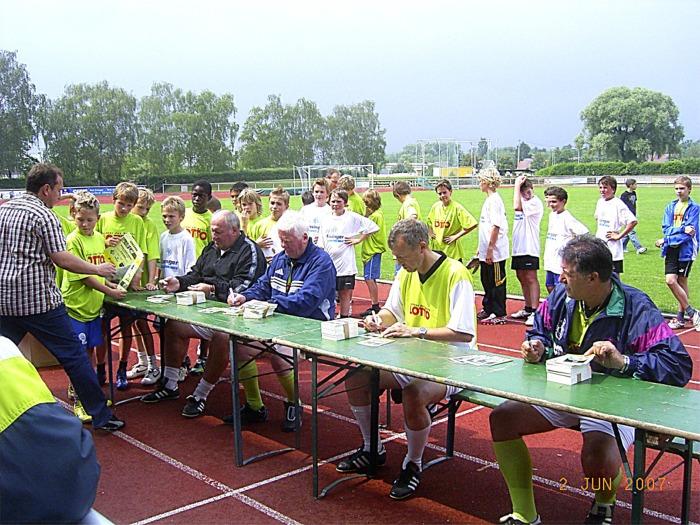 Bei der anschließenden Autogrammstunde bedankten sich die Präsidenten der beiden Vereine R. Interwies und H. Rees für das Event bei den Promis und überreichten Präsente zum Andenken. Als Erinnerung bekamen alle Jungs noch eine Trinkflasche und Urkunden von den Sponsoren überreicht. Die Jungs waren sich nach der Veranstaltung einig, dass das Prominententraining viel Spaß gemacht hat.