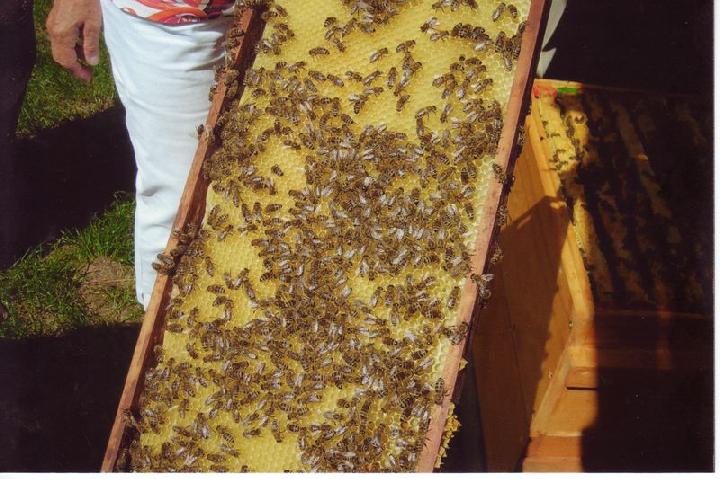 Der oberste erste Kasten ist der Ort der Honigherstellung. Der Bienenzüchter entnahm eins der darin hängenden Rähmchen. Deutlich konnten die Besucher die zugedeckelten Honigwaben erkennen.