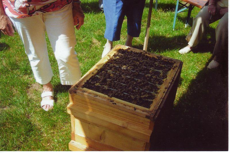 Vor dem nächsten beiden Teilen, den Bruträumen für 40000 Bienen, war ein Gitter, das nur die Arbeitsbienen zur Brutpflege durchläßt. Auch hier konnten die Senioren in einem Rahmen die verschieden Phasen im Entstehen einer Biene ansehen. Waben mit Eiern, Waben mit Larven.