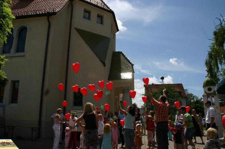 Ein weiters Highlight war der Luftballonwettbewerb, bei dem Kinder und Erwachsene auf ihr Kärtchen herzige Bilder malten. Viele rote Herzluftballons verließen in östlicher Richtung am Kirchturm vorbei Eislingen.