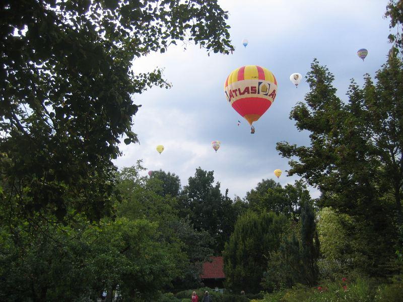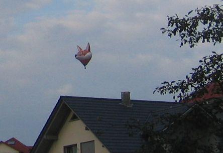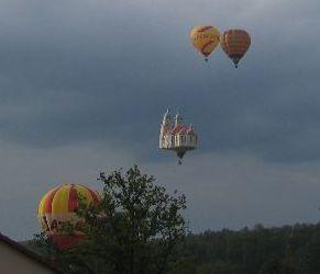 Samstagnachmittag gegen fünf: Der Himmel über Eislingen ist voller Farbflecke - Ballon aller Größen und Formen schweben über die Eislinger Nordstadt Richtung Ottenbacher Tal, ein Fuchskopf geht in Führung, gefolgt von allerlei Heißluftballonen. Das skurrillste Objekt: eine barocke Wallfahrtskirche, die dann allerdings als großer Gummihaufen kläglich im Frauengehäu auf der großen Wiesen hinter dem Vogelgarten endet.