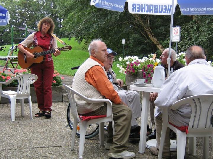 Frisch gestärkt erklangen mit Gitarrenbegleitung von Frau Dangelmaier Volks- und Wanderlieder, alles Wünsche der Bewohner von St. Elisabeth. Pfr. Ongum wünschte sich „Wenn ich ein Vöglein wär“ (Ob er wohl an zuhause dachte?). Den Abschluss machte das schwäbische Aufbruchslied „Muss i denn, muss i denn zum Städtele hinaus“. Viel Beifall gab es für Frau Dangelmaier und Dankesworte und großes Lob für Vorstandsmitglied Hans Saile, der alles mit Frau Briem so gut organisiert hatte. Danach wurden alle und alles in die Autos eingeladen.