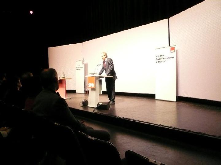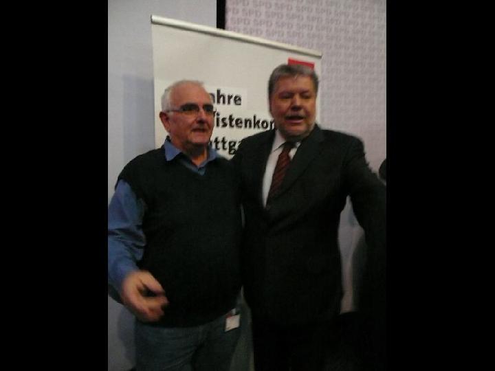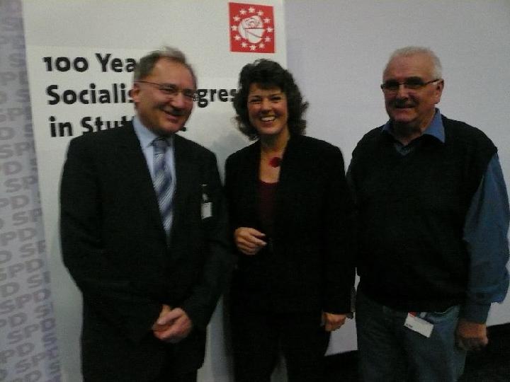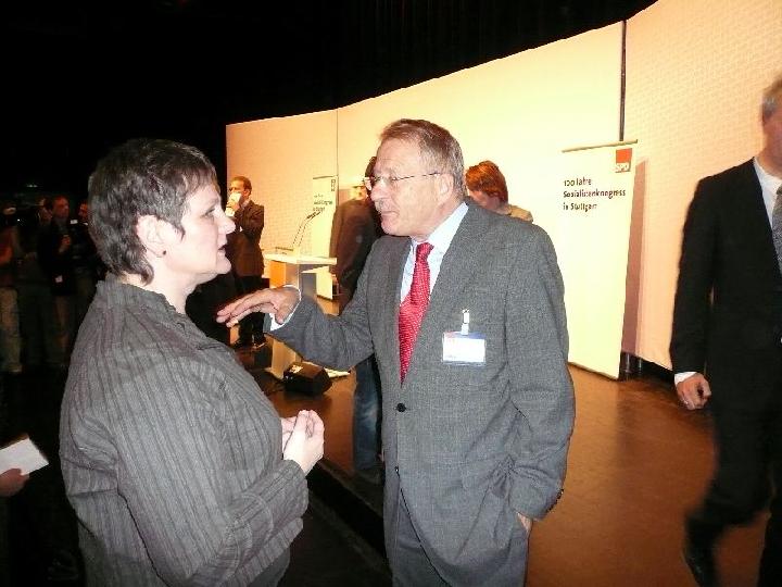 Nicht schlecht staunte der Eislinger Stadtrat Peter Ritz und die verdi- Vorsitzende Leni Breymaier am vergangenen Sonntag, als der Stuttgarter OB Wolfgang Schuster ('Schusti')im Theaterhaus in Stuttgart ein Loblied auf die SPD sang; diese habe das Ausbluten der Kommunen verhindert und abgesichert, dass weiterhin vor Ort die Gewerbesteuer bezahlt wird. Insgesamt war der Festakt zur Erinnerung an den ersten internationalen Sozialistenkongress in Stuttgart hochinteressant, da sich zeigte, dass SPD und Gewerkschaften wieder aufeinander zugehen. Bei allen Unterschieden, so DGB-Chef Michael Sommer ('Mein Freund Michael')gebe es doch viele Gemeinsamkeiten. Die Forderung nach einem Mindestlohn sei sicher eine ganz wichtige.