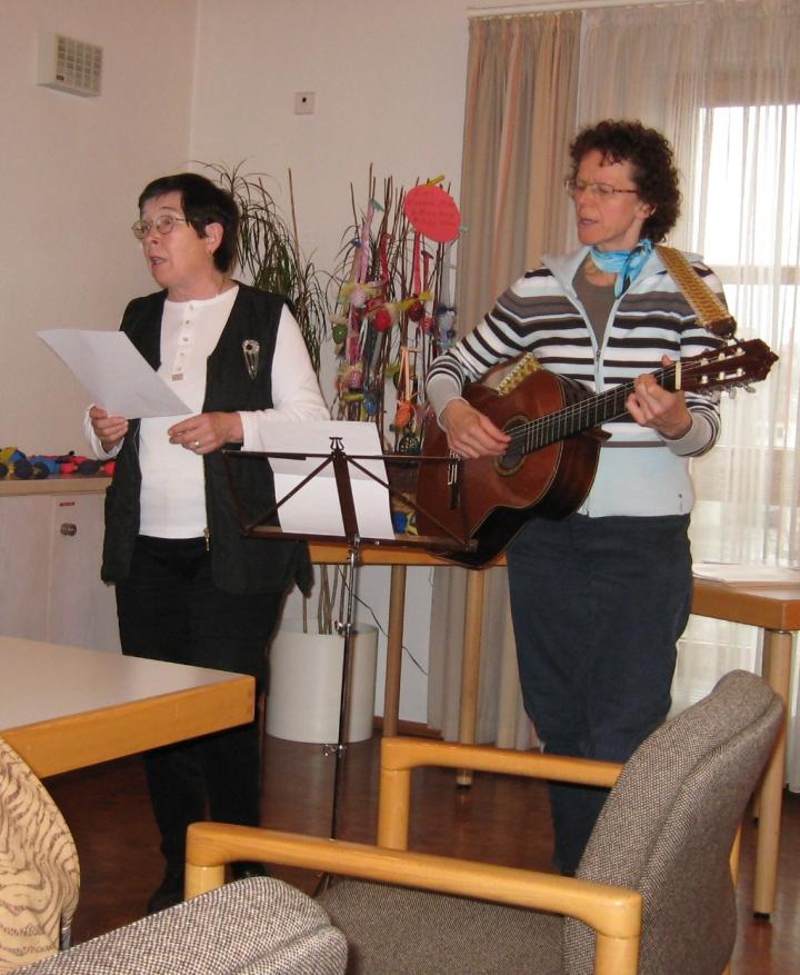 Sie und Anni Dießenbacher fungierten als Vorsängerinnen, das Publikum sang mit beim Refrain kräftig mit. Vor dem Abschluß des Nachmittags mit dem Volkslied Wenn alle Brünnlein fließen erheiterten noch die Erlebnisse eines Kellners beim Bedienern einer 10köpfigen Damenrunde die Zuhörer.