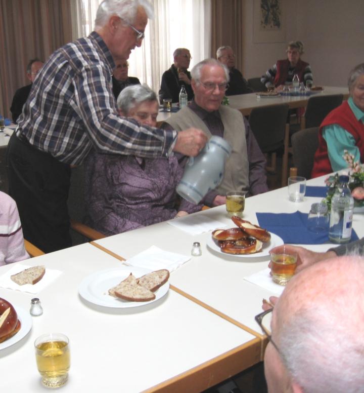 In Vertretung von Frau Schmid begrüßte der 2. Vorsitzende Herr Bartenbach die Anwesenden. Gleich nach einem Frühlingsgedicht von Erich Kästner begannen er und weitere Vorstandsmitglieder süffigen Birnenmost einzuschenken.