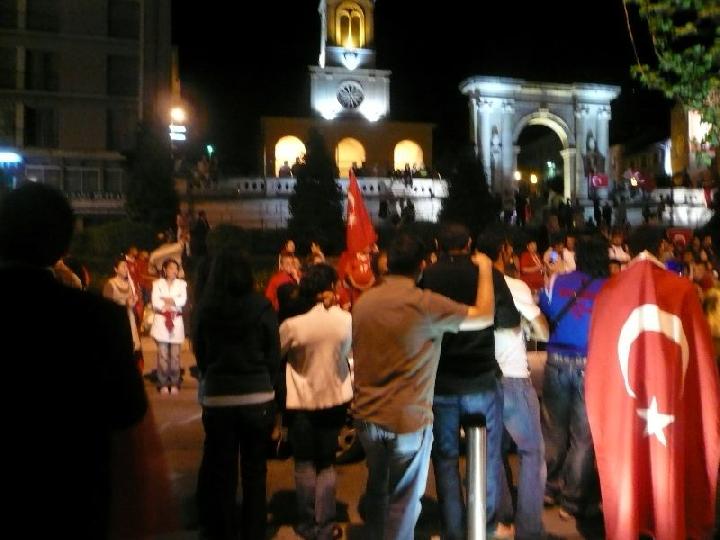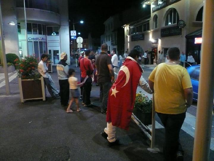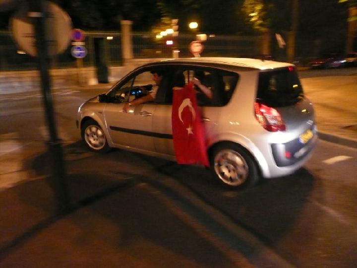 Im Centre Culturel Aragon war der musikalische Abend 'Concert D'Harmonies' gegen halb zwölf zu Ende gegangen. Auf dem Heimweg die ersten türkischen Fahnen. Immer dichter die Menschenansammlung bis zum Höhepunkt vor dem großen Bogen in der Stadtmitte: Ein großer Autokorso würde durch die türkische Nationalfahne mit viel Hupen und Freudenschreien geführt. Unterstützung kam von den Arbeitskollegen aus dem Senegal, aus Marokko, aus allerhand ehemaligen Kolonien der Franzosen. Mein 'Je suis allemand' löste zunächst einmal Anspannung aus: Gab's jetzt Zoff mit dem Gegner vom nächsten Mittwoch? 'Le meilleur gagne - der Beste wird gewinnen' entspannte dann die Lage. Der schwarze Block der Gendarmerie stand beobachtend abseits. Es hatte wohl beim Spiel davor fliegende Blumenkübel gegeben. Gegen zwei Uhr ging das große Freudenfest dann friedlich zu Ende. Nicht ohne eine kleines Wunder: Drei junge Türken mit einem Deutschen, Gespräch über Fußball, 'Ein Eislinger ist Torwart bei Galaterserai Istanbul', ja natürlich rufen die Jungs, 'Aykut Ercetin', ein toller Spieler, so die Fans. Als Aykuts alter Englischlehrer dann seine Nummer nicht auf dem Handy hatte, war die Enttäuschung groß. Woran man nicht alles denken muss, wenn man in die Partnerstadt nach Frankreich fährt.