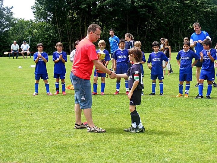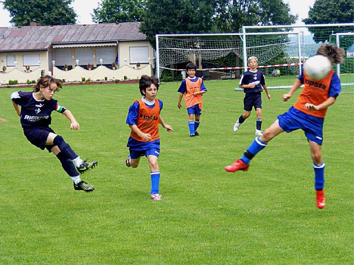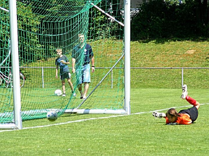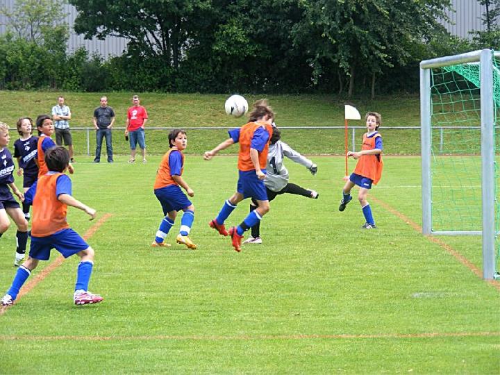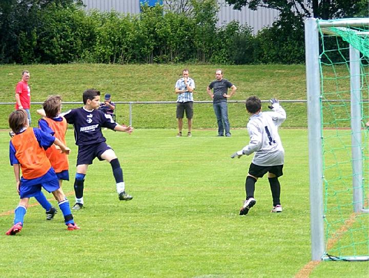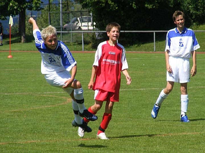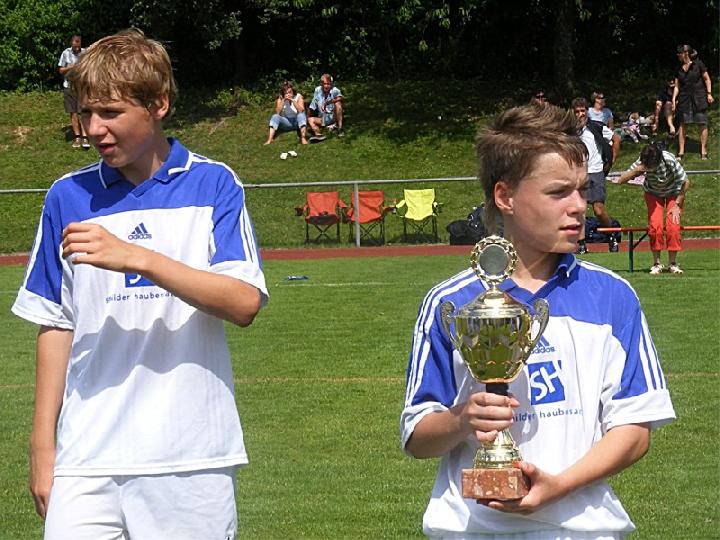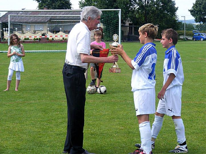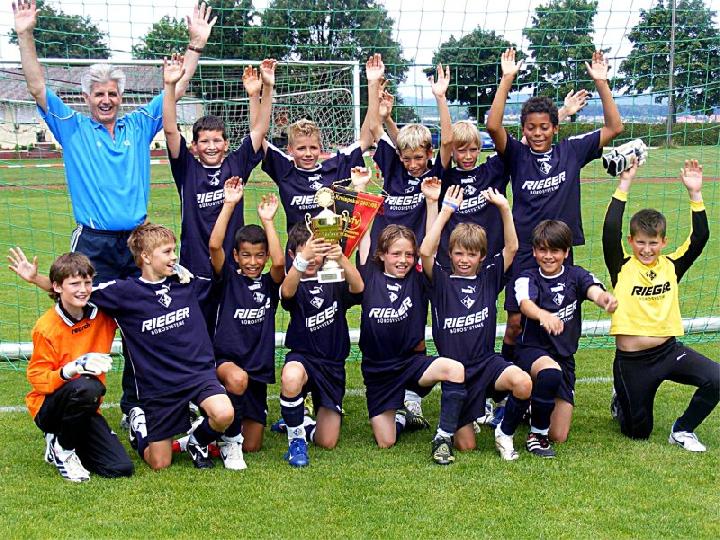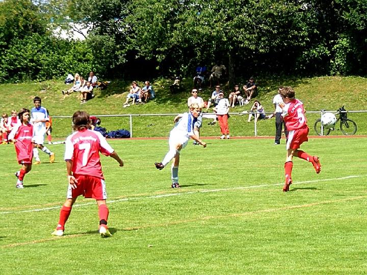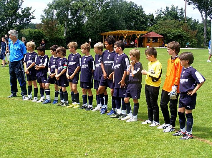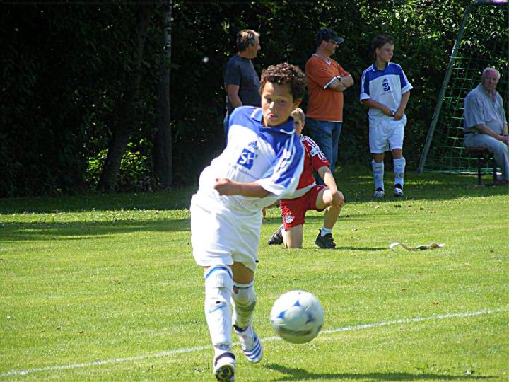 Mit einer eindrucksvollen Vorstellung verabschiedete sich die U 13 des FC vom Spielbetrieb im Spieljahr 07/08. Im Pokalendspiel war der Nachwuchs des FC Donzdorf den Eislingern in allen Belangen unterlegen. Die Blau-Weißen zeigten nochmals ihr ganzes Können und sprühten nur so vor Spiellaune und Laufbereitschaft. Während der gesamten 60 Minuten rollte Angriff auf Angriff Richtung Donzdorfer Tor, dessen trotz allem glänzend haltenden beiden Keeper sich mit Glanzparaden überboten. Sehenswerte Angriffsaktionen begleiteten das Eislinger Angriffsspiel und wunderschöne Tore ließen die Zuschauer immer wieder mit der Zunge schnalzen. Bereits nach 3 Minuten lag der Ball durch Tore von Oliver Kupka und Patrick Bernecker im Donzdorfer Gehäuse. Der selbe Spieler markierte das 3:0. Zum 4:0 zeigte sich wiederum Oliver Kupka verantwortlich und ein Distanzschuss von Kevin Gromer markierte das 5:0. Den 6:0 Halbzeitstand erzielte Max Hölzli. Nach dem Wechsel ging der Einbahnverkehr Richtung Donzdorfer Gehäuse weiter. Tolles Flügelspiel, Direktabnahmen und Distanzschüsse waren auf Seiten des FC weiterhin an der Tagesordnung. Doch mit einem Konter verkürzten die nie aufgebenden Lautertäler den Anschluss. Eislingen ließ sich jedoch nicht beirren und nutze nun die Torchancen eiskalt. Max Hölzli mit 2 fulminanten Fernschüssen, Isaac Houssou mit Abstauber und Kai Hartmann mit überlegtem Flachschuss waren die Torschützen zum auch in dieser Höhe mehr als verdienten Kantersieg. Man darf dem Eislinger Nachwuchs zu dieser Leistung nur beglückwünschen und jeder der anwesenden Zuschauer hatten in Hattenhofen seine wahre Freude an diesem Jugendspiel. Die Titelsammlung ist mit dem errungenen Sieg beim Pokal komplett und beweist eindrucksvoll die Übermacht der Blau-Weißen in dieser Saison. Ein sicher noch nie da gewesener Erfolg einer FC-Mannschaft im Jugendfußball, der nicht hoch genug zu würdigen ist.