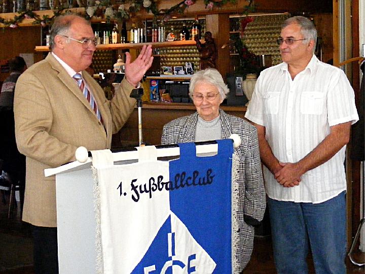 Außer der Reihe wurde Gisela Heck von FC-Präsident Rainer Interwies mit einem Blumenstrauß für ihr vielfältiges, sehr großes Engagement beim 1. FC Eislingen ausgezeichnet. Ebenso wurde der Betreuer der 1. Mannschaft Alfredo Sotgiu für seine zuverlässige Mithilfe bei den Vereinsfesten ausgezeichnet.