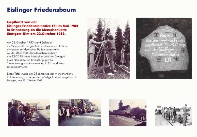 Die Friedenslinde wurde nach erfolgreichen Abschluß der Menschenkettenaktion zur Erinnerung im Jahr 1984 gepflanzt. Jetzt nach 25 Jahren sollte eine Infotafel über die weltweit beachtete Aktion erinnern, so die Idee von Peter Ritz und Hans-Ulrich Weidmann. Beide haben das Projekt finanziert und mit Unterstützung des Eislinger Bauhofs konnte die Aufstellung durchgeführt werden.