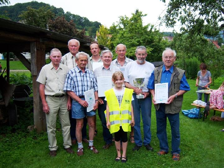 Er gratulierte den neuen Meistern der Württembergischen Rassegeflügelzucht Heinz Bückle und Hans Mayer zu dieser verdienten Ehrung nochmals und es wurden an folgende Mitglieder Ehrungen ausgesprochen. BDRG- Ehrennadel in gold an Hans Strangfeld, VDT- Ehrennadel in Gold an Hans Gutbrot und Rolf Maunz und in silber an Emil Kielkopf, Alexander Traxler konnte die Landesverbandsehrennadel in silber aus der Hand des 1. Vorstands erhalten. Den gestifteten Pokal der Villanyer Zuchtfreunde konnte Josef Kolb als bester Mitarbeiter der letzten Stauferschau und für diese bestens ausgerichtete Sommertagung in Empfang nehmen, hier bedankte sich auch der Vorstand auch mit Blumensträußen bei Renate Müller und Frau Kolb für die Mithilfe bei den Vorbereitungen und dem Ablauf dieses Treffens. Auch unser Vorstand hat eine Ehrung verdient, ob er nun wollte oder nicht und wenn man so selbstlos und mit unermüdlichem Engagement seit Jahren an der Vereinsspitze agiert wie Stefan Raindl ( amtierender Bundessieger mit Chabo , Nationale Erfurt 2008) , so hat er für seine Verdienste die Landesverbands Ehrennadel in Gold unter dem starken Beifall der Vereinsmitglieder als Auszeichnung erhalten. Die Jugendgruppe, welche mit der Jugendleiterin Alma Schmidt einen Spiel-, Bastel- und Malnachmittag innerhalb dieses Treffens durchführte ließ sich nicht stören, so eifrig waren sie bei der Sache.