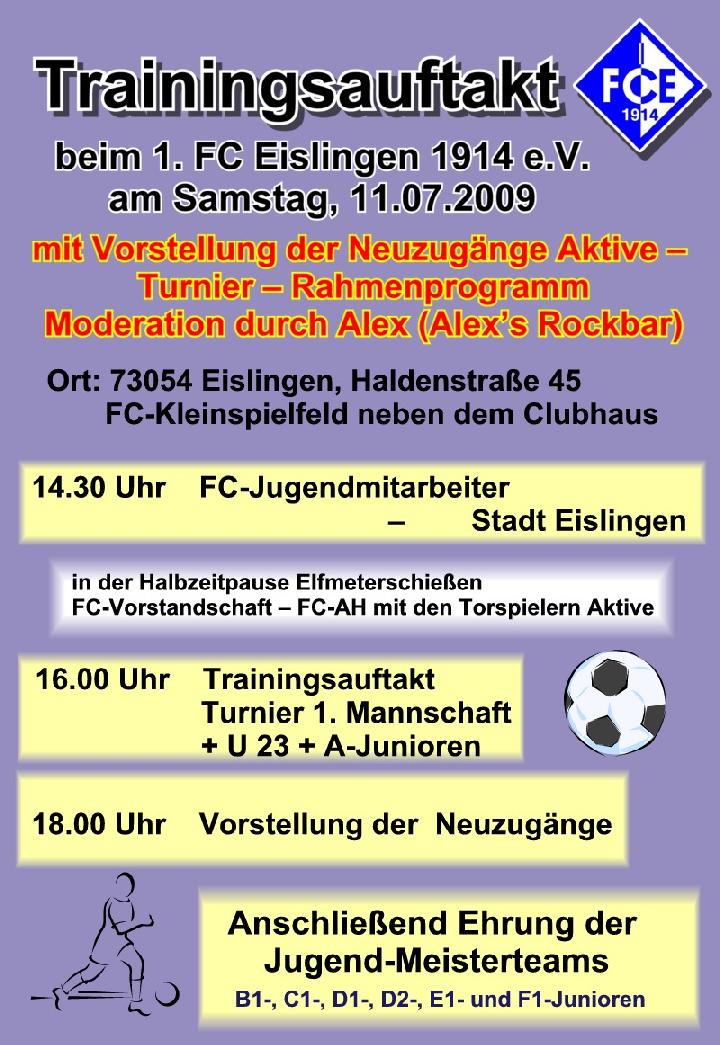 Aus Anlaß des Trainingsauftakts für die Saison 09/10 werden nicht nur die Mannschaften vorgestellt. Mit einem Turnier, Einlagespiel und lustigem Elfmeterschießen wird dem interessierten Zuschauer ein mit Fußball gewürzter Samstag-Nachmittag geboten.
