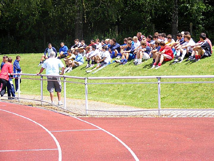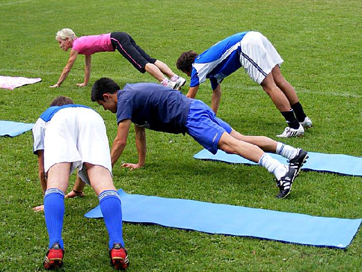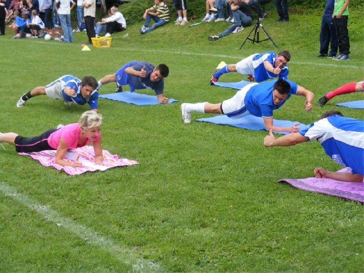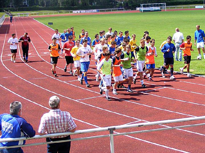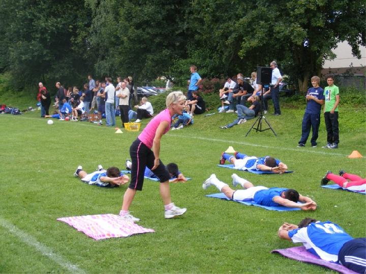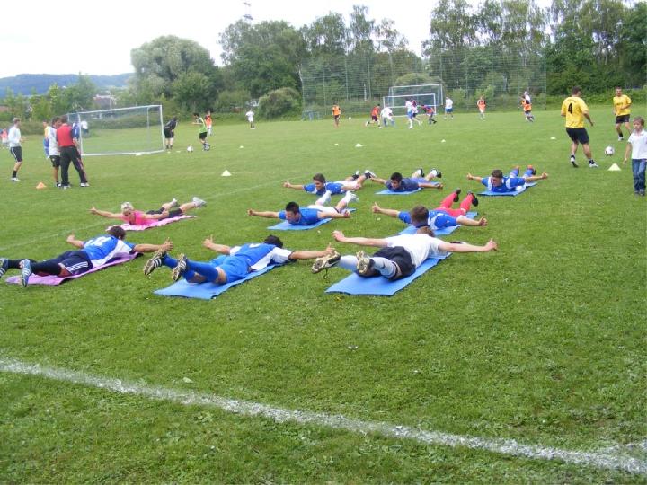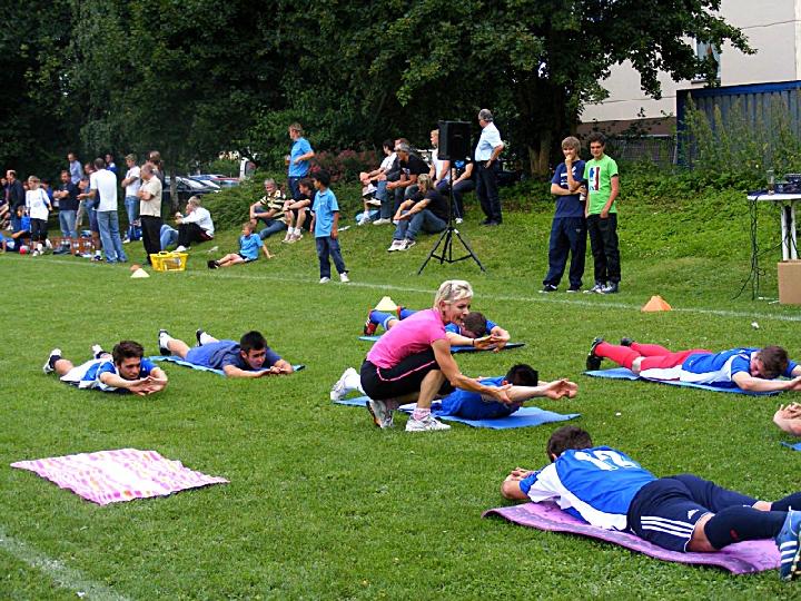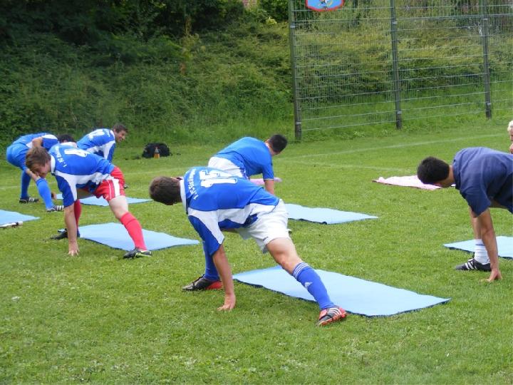 Zum Abschluss der ersten Trainingseinheit gab es ein Stelldichein auf dem Kleinspielfeld mit einem Turnier in gemischter Form, Technikübungen und Gymnastik.