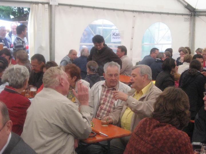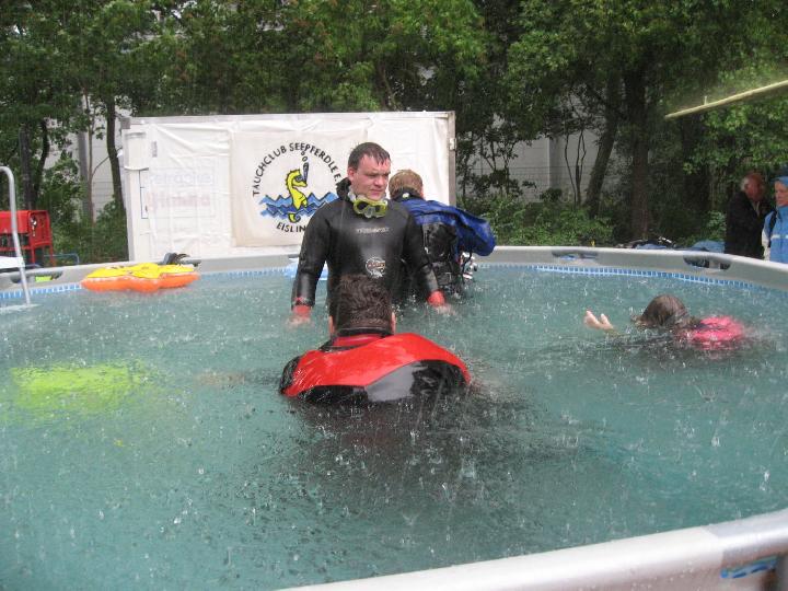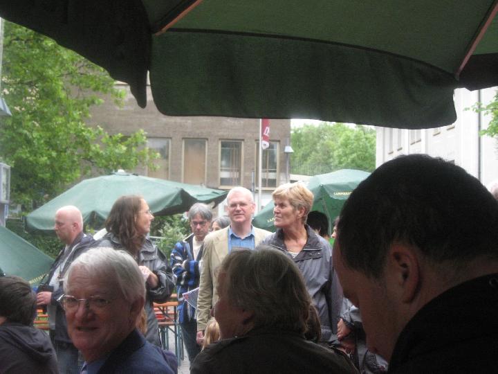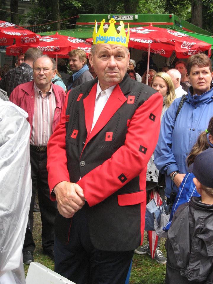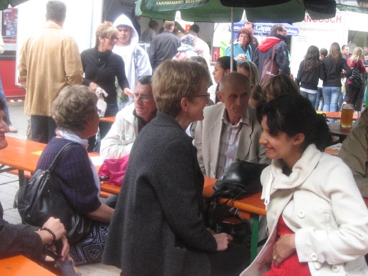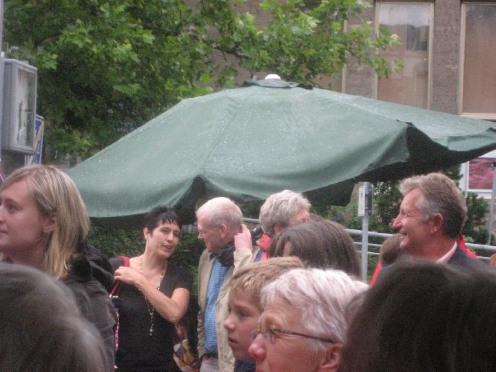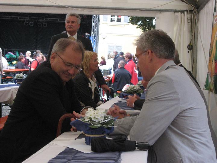 Auch das Rahmenprogramm des Stadtfestes musste nicht auf den 'Segen von oben' verzichten: es regnete. Teilweise goss es auch. Inzwischen war man das gewohnt und der guten Stimmung tat es keinen Abbruch. Auf 3 Bühnen zeigten sich Schulen, fetzige Bands und Gäste aus Oyonnax, die Reggae aus dem Jura boten. Auch die politische Prominenz hielt es lange aus, darunter befand sich - erstmals offiziell in Eislingen - der neue Landrat Edgar Wolff. Eislingen hat schöne Männer... |