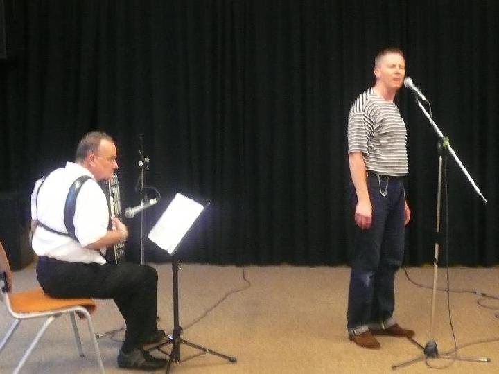 Als morgens um 3 Uhr die letzten Mohikaner die Bühne verließen war klar: Der Ehemaligen-Treff am Erich Kästner Gymnasium war ein voller Erfolg. Seit 19 Uhr waren zig-hunderte von ehemaligen Schülerinnen und Schülern ins EKG geströmt und hatten sich mit ehemaligen und noch aktiven Lehrerinnen und Lehrern, mit ihren Klassenkameraden getroffen und Lebenserfahrung ausgetauscht. Die Atmosphäre war phantastisch - die Freude über das Wiedersehen, über die Gelegenheit zum Austausch war greifbar. Selbst als Lehrer seit 1973 dabei, war ich überwältigt von dem warmen freundlichen Rückblick und dem Ausblick auf so unterschiedliche Lebenswege. Die Bigband stimmte ein, Schulleiter Michael von Hagen begrüßte, Günther Fingerle beeindruckte als Hans Albers, gekonnt begleitet von Dieter Läßle am Akkordeon, die (fast) Ehemaligen Band CAM Project mit u.a. Frank Kellenbenz und Alexander Sauer, Gespräche, Jochen Tham aus den USA, Emil Penzenstadler aus Wien, aus allen Weltgegenden angereist, ein toller Abend einer Schulgemeinschaft über die Jahre hinweg. Günther Fingerle gibt den Hans Albers vor Fangemeinde |