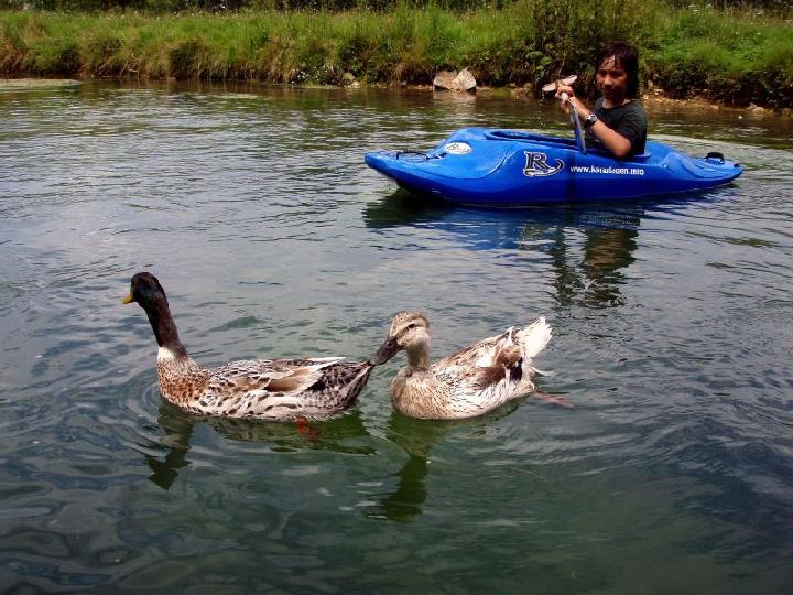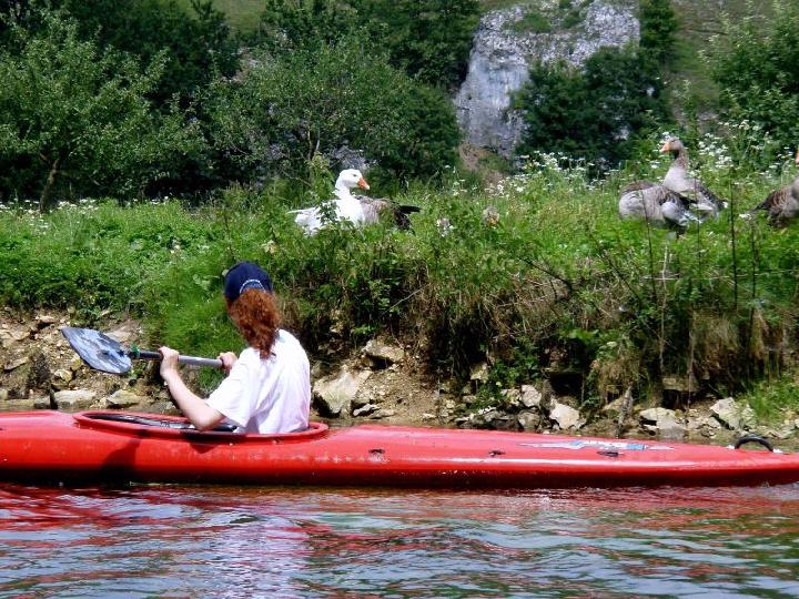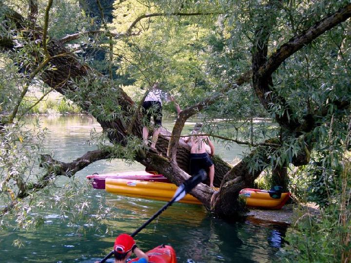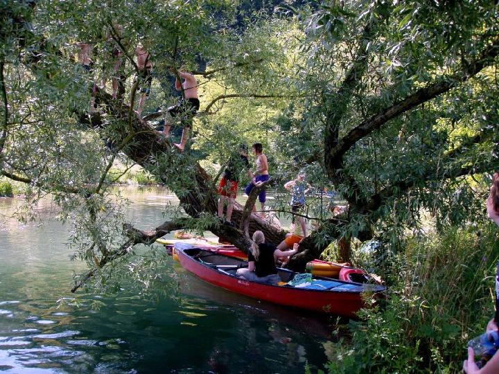 Paddeln durch fast unberührte Natur, einer stellenweise wildromantischen Landschaft mit Wasserpflanzen, Weiden und Felsen. Vorbei an den 8 Meter hohen Felsen der Steinernen Jungfrauen. Auf der durch das Naturschutzgebiet sich schlängelnden Brenz zogen Enten und Schwäne mit ihren Jungtieren an den Eislinger Kanuten vorbei, springende Fische in der Brenz und auch eine Gänsefamilie ruht gemütlich am Ufer. Für die jungen Kanuten wurden noch Spiele mit Ball, Boot und Paddel während der Fahrt mit eingebaut. Die Eislinger Wasserratten waren nicht die einzigsten auf der beschaulichen Wasserstrasse. Es herrschte reger Schiffsverkehr auf diesem Teil der Brenz. Die rund 3 Stunden dauernde Fahrt wurde durch einen Umsetzvorgang und einem Badestopp unterbrochen. Beim Umsetzvorgang werden meist die Plätze in den einzelnen Booten getauscht, damit jedermal in den verschiedenen Booten fahren darf. Für die ganz Mutigen stand am Schluss noch ein Sprung vom Baum ins kalte Wasser an. Kaum ein Teilnehmer blieb von unseren Wasserpiraten Flori und Mike verschont. Sie spritzten ihre Opfer von oben bis unten nass und selbst eine Kenterung wurde in Kauf genommen, wenn die Gegenwehr zu stark war. Als Sondereinlage wird bei dieser Veranstaltung unterwegs aus allen vorhandenen Booten ein großes Floss formiert. Dabei müssen wenigstens die beiden äußeren Kanuten über das Floss die Plätze tauschen. Nicht selten geht dies nicht ohne Wasserberührung vonstatten. Nicht nur für die Beteiligten eine riesige Gaudi.