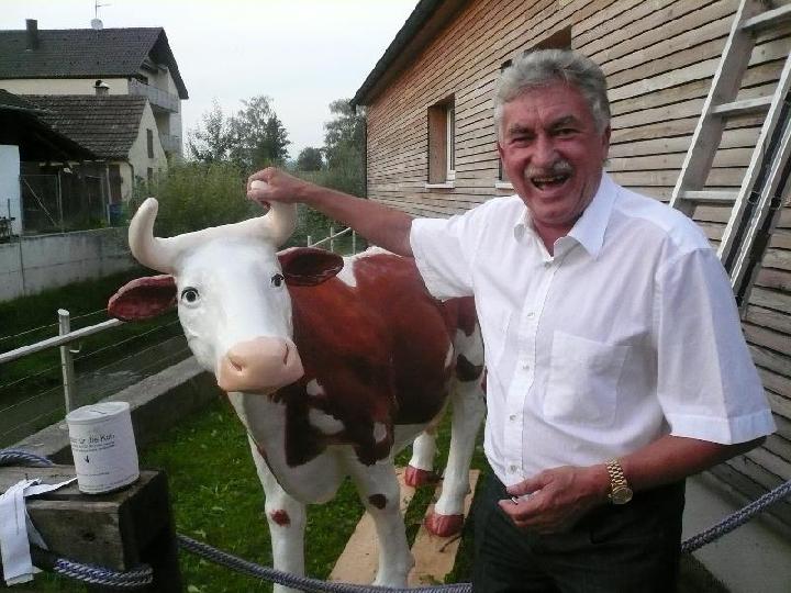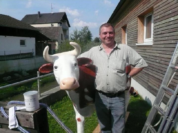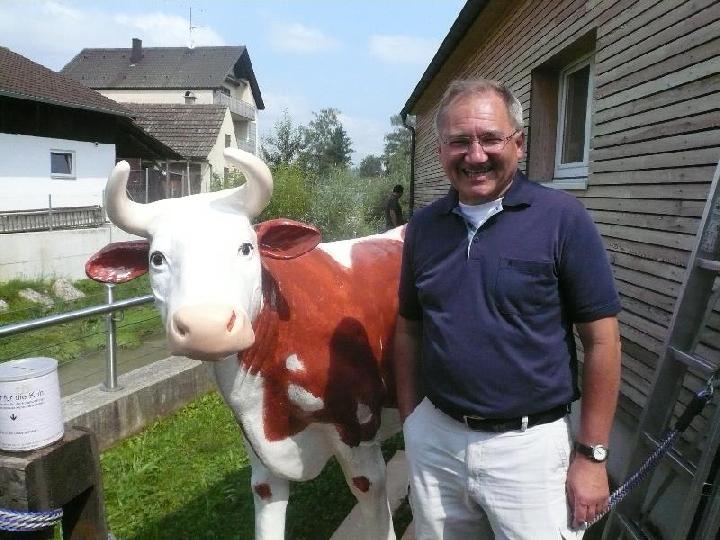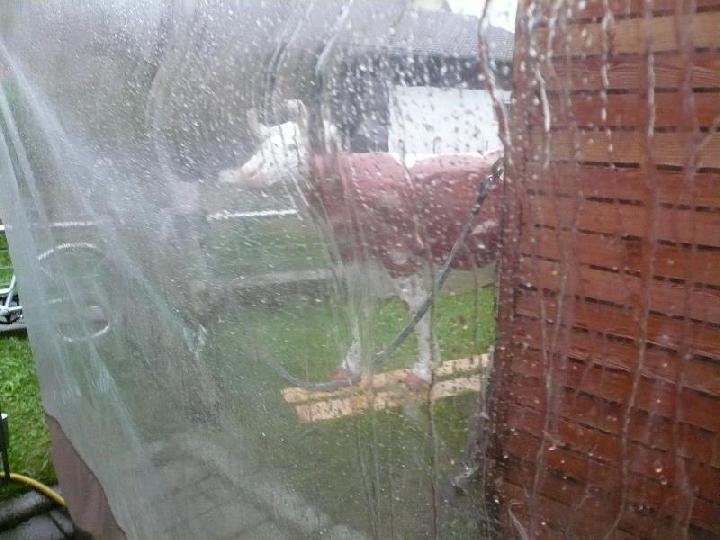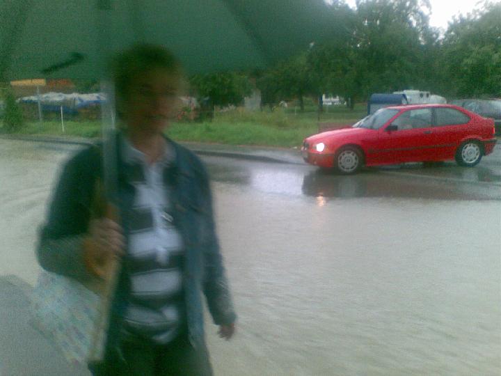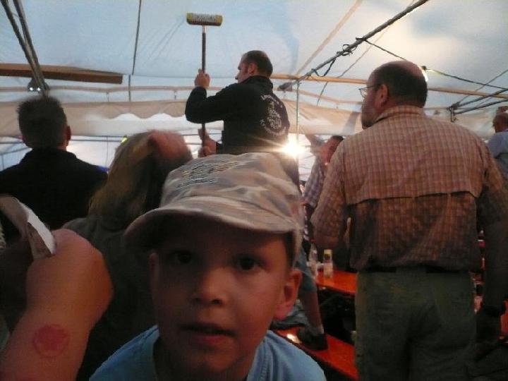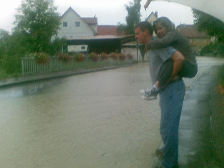 Als Bürgermeister Günther Frank mit Hartmut Komm, dem Vorsitzenden des Obst und Gartenbauvereins Krummwälden am Samstagnachmittag gegen 16 Uhr mit zwei Schlägen das Fass anstach, assistiert vom Chef des Löschzugs 3 der Eislinger Feuerwehr, Alexander Mühleis, war noch nicht klar, dass in wenigen Stunden Krummwälden in einem See (beinahe) verschwinden sollte - gegen 21 Uhr brachen die Himmelsschleusen und die mit begeisterten Hockbesuchern vollbesetzten Zeltarrangements rund um das Feuerwehrmagazin versuchten standhaft gegen die Fluten von oben zu bestehen. Die gesamte Feuerwehr und viele freiwillige Helfer versuchten die Wassermassen mit Besen und Stecken zu lenken. Ein interessanteres Programm hätte man nicht zusammenstellen können, oder? Plötzlich Alarm: Alle Autos auf der Brückenstraße wegfahren, die Flut kommt von den Hängen westlich Krummwäldens. Die Ortdurchfahrt wurde gesperrt, einige Keller liefen voll, St Christophorus trug seine Frau durch die Fluten zum Parkplatz ... St Christophorus auf der Brückenstraße |
