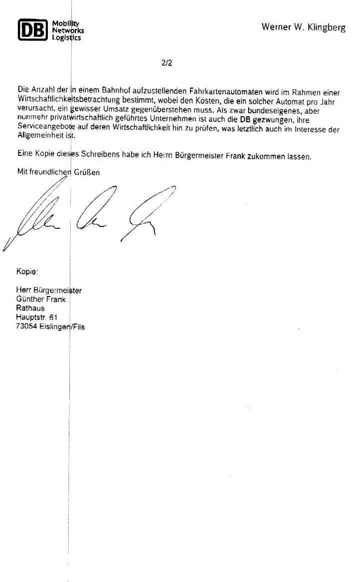 Auch einem weiteren Kritikpunkt von SPD, AWO und ACE widerspricht Werner W. Klingberg: Die Anzahl der in einem Bahnhof aufzustellenden Fahrkartenautomaten werde im Rahmen einer Wirtschaftlichkeitsbetrachtung bestimmt, „wobei den Kosten, die ein solcher Automat pro Jahr verursacht, ein gewisser Umsatz gegenüberstehen muss“. Harald Kraus verlangt dagegen die Aufstellung eines weiteren Automaten, um den Bahnkunden das Lösen einer Fahrkarte „stressfrei zu ermöglichen“. „Ich bin sicher, dass sich ein zweiter Automat auch rechnet“, erklärte er.