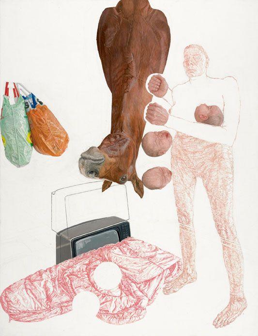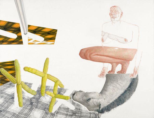 Bettina van Haaren zeichnet und malt, meist beides zusammen in einem Bild. Und ebenso oft findet sich in ihren Arbeiten eine Ansammlung von Einzelgegenständen, die den Charakter ihrer künstlerischen Aussagen entscheidend mitbestimmen. Im Mittelpunkt steht immerein Mensch, vorwiegend sie selbst. „Meine Arbeiten sind Selbstbilder, weil ich über mich und meine Körpererfahrungen am meistem sagen kann“, ist ihre Erklärung