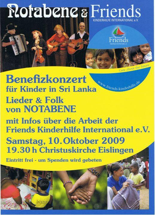 Am Samstag, den 10. Oktober 2009 findet in der Eislinger Christuskirche ein Benefizkonzert der Musikgruppe NOTABENE zu Gunsten der FRIENDS Kinderhilfe International e.V. statt.