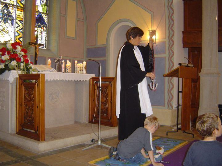 Als Symbol für die Taufe brachte Pfarrerin Korn einen Anker mit, der nach dem Gottesdienst von den Kindern aus Tonkarton nachgebastelt wurde. Gemeinsam wurde festgestellt, dass die Taufe der wichtigste Tag im Leben eines Menschen ist. Außerdem erfuhr man von Martin Luther, der sich bei Selbstzweifeln immer wieder vor Augen führte „Ich bin getauft“.