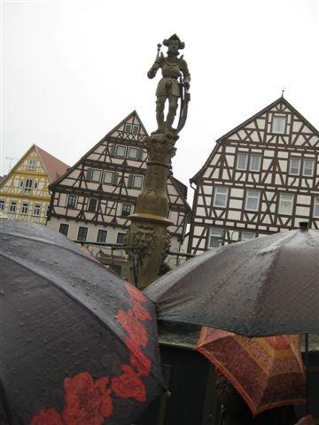Trotz dieses ungemütlichen Wetters bewunderten wir das stattliche Rathaus und das Salzhaus. Vorbei an der Stadtkirche ging es zum Schloss und schließlich zum Prunkstück der Stadt, dem Pomeranzengarten. Er wurde 1609 von Heinrich Schickhardt für die Herzoginwitwe Sibylla von Württemberg angelegt und ist der einzige erhaltene Renaissancegarten im Lande. Mit eingefassten Beeten und kunstvollen Brunnen bot er auch im Herbstkleid ein freundliches Bild.