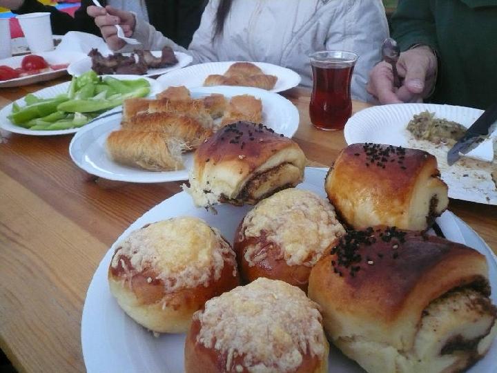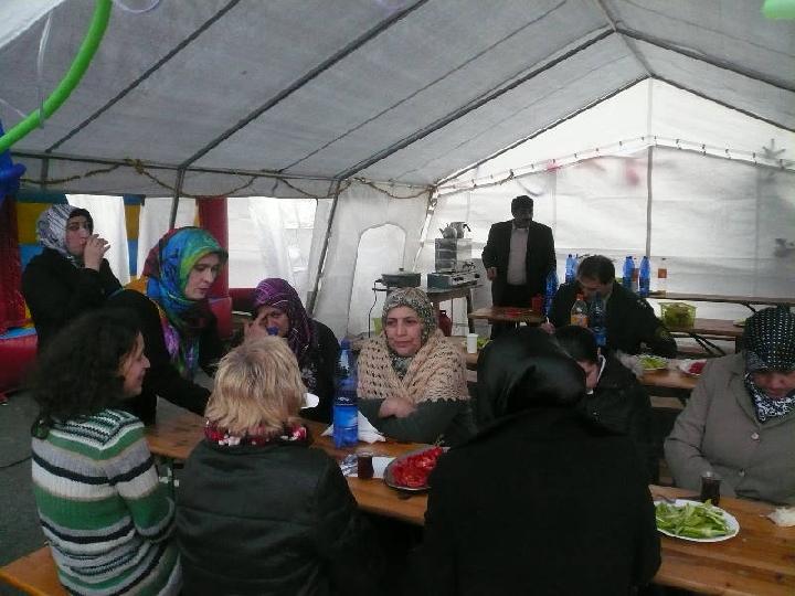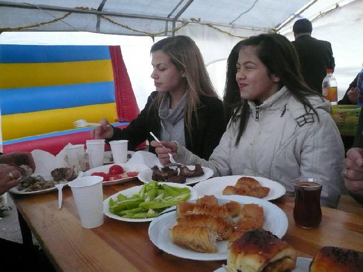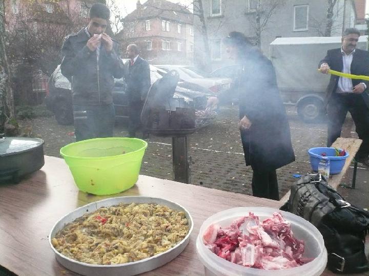 Zum Gedenken an Abrahams Willen, seinen Sohn auf Befehl Gottes zu opfern, und die glücklicher Errettung von Isaak feiern die Muslime jedes Jahr das Opferfest mit einem Festmahl, zu dem Gäste eingeladen werden und Arme gespeist werden. Diese alte Tradition wird in Eislingen vom Türkischen Kulturverein gepflegt. Auch viele Gäste aus der Kommunalpolitik waren zugegen, der stellvertretende Bürgermeister wegen einer Konferenz an der Schule etwas später. Lamm und Gemüse im Freiluftspeisesaal |