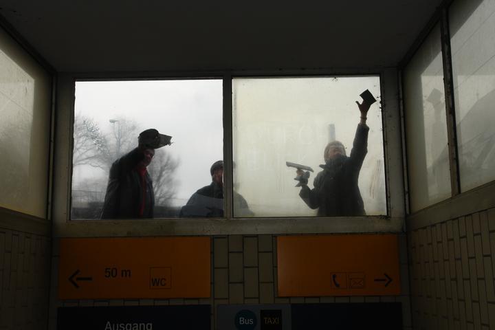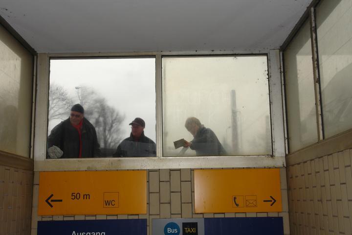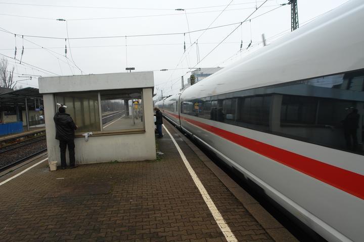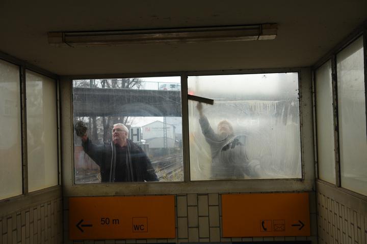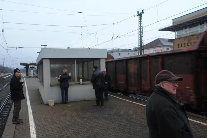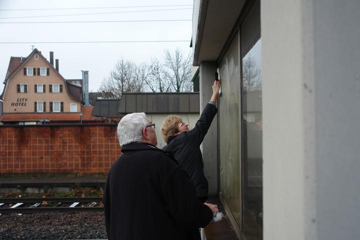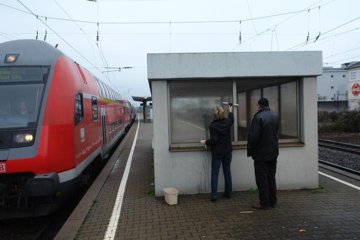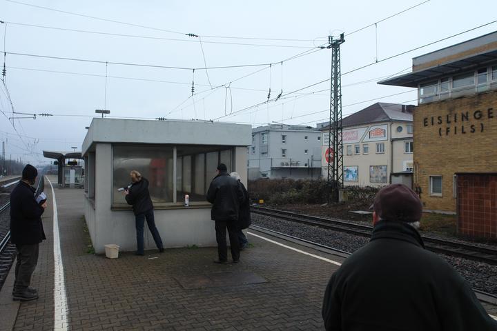 Unbeeindruckt von ICE und Güterzug SPD Eislingen putzt die Bahnhofsscheiben 12.12.2009 - Hans-Ulrich Weidmann