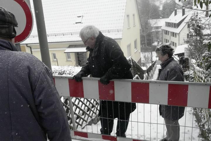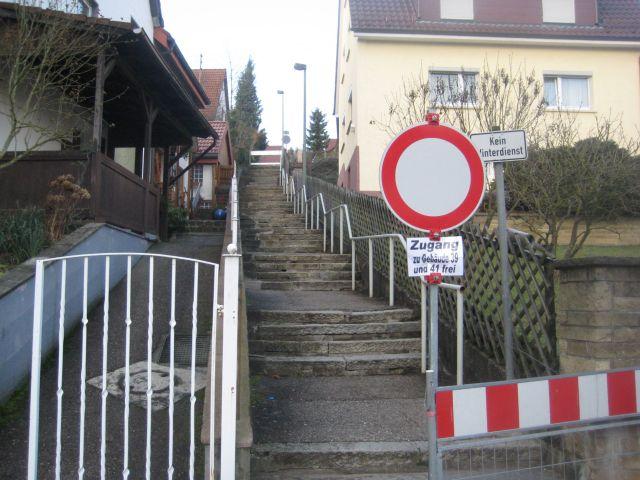 Auf Anregung von Anliegern trafen sich Redakteure von Eislingen-Online am Samstagmorgen mit Bürgern aus dem Stieglitzweg und der Ziegelbachstraße vor Ort (siehe Bilder). Die Anlieger von Ziegelbachstraße 39 und 41 haben noch (provisorischen) Zugang zu ihren Häusern, denn als diese in den 50er Jahren gebaut wurden, war die Treppenanlage die Haupterschließung. Wenn aber der Nachbar vom Stieglitzweg mit dem Auto die Einkäufe bringt, steht er vor einer Barriere: Gesperrt! Eislingen-Online meint: Die Sperrung kann nicht das letzte Wort sein - die Eislinger Wegle sind dazu da, die Bürgerinnen und Bürger miteinander möglichst bequem zu verbinden. Heute braucht es ca.500 Schritte bis sich die direkten Anlieger besuchen können. Herr Lange und Frau Zwicker durch eine Mauer getrennt: |
