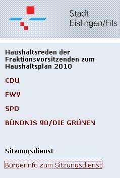 Die neue Homepage der Stadt Eislingen machts möglich. Jetzt sind dort die Haushaltsreden für jedermann/frau abrufbar. Schön ist auch der Informationsdienst über die Gemeinderats- und Ausschußsitzungen. Damit kann man sich ab sofort online über Termine und Tagesordnung informieren. - Mal sehen, wann der erste Gemeinderat direkt aus der Sitzung twittert. -