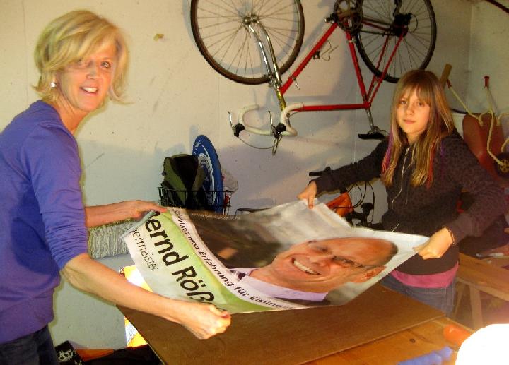 Gabriele Rößner und Tochter Sarah beim Aufkleben der Wahlplakate