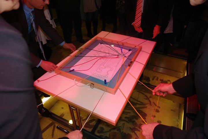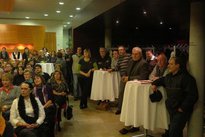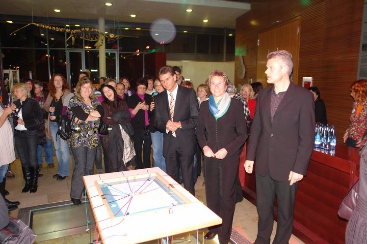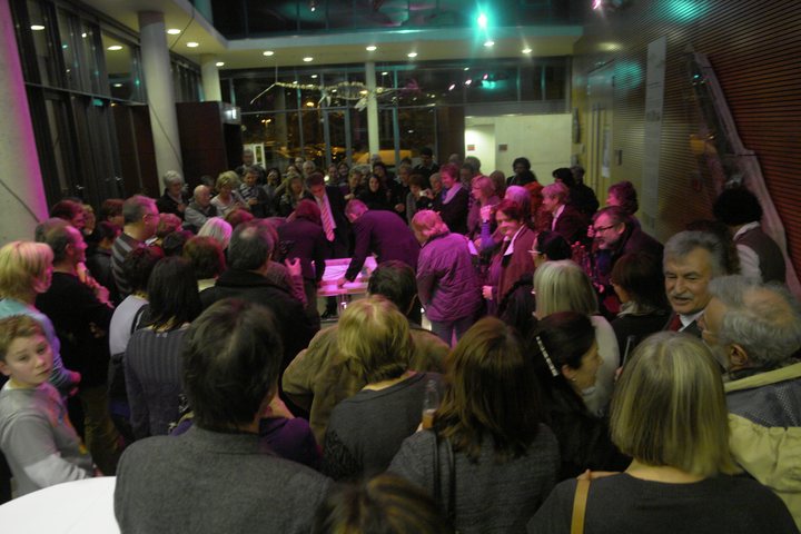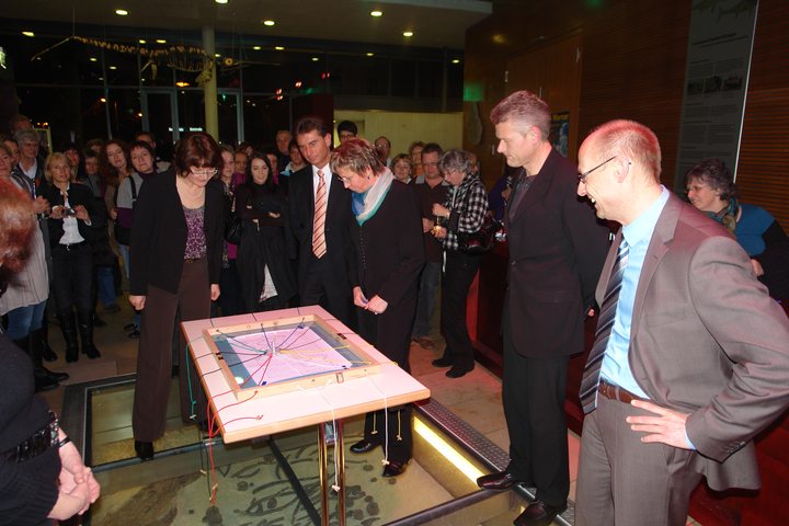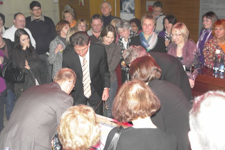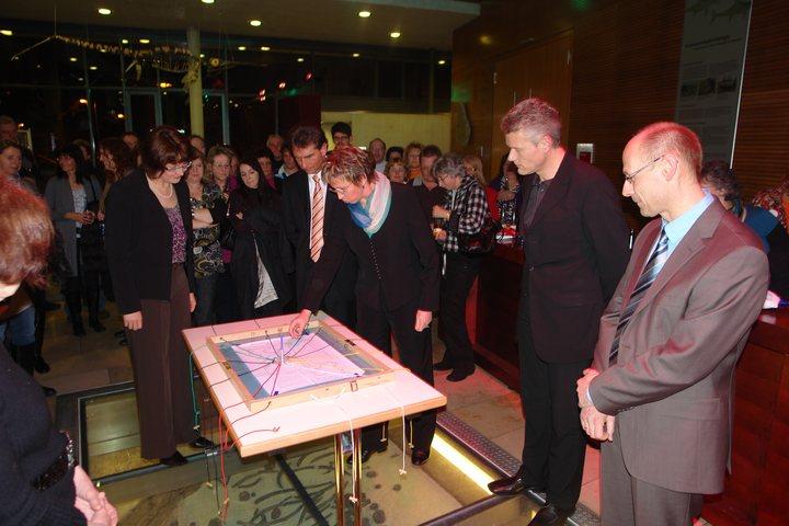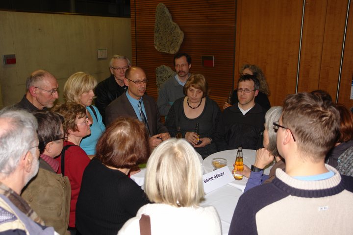 Nach dieser kurzweiligen Fragerunde ging es in das kleine Foyer. Dort waren Stehtische für jeden Kandidaten und Kandidatin aufgestellt und es konnten in kleiner Runde weitere Themen mit den Bewerbern besprochen werden. Aufgelockert wurde dieser Teil des Abends durch ein 'Teamspiel', der gemeinsame Weg ins Rathaus, bei dem die Bewerberin und die Bewerber ihre Teamfähigkeit humorvoll unter Beweis stellten.