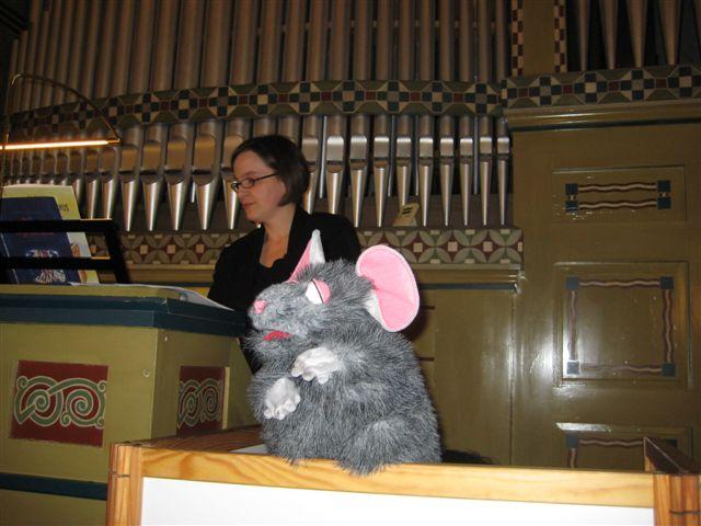 Wie entsteht ein Ton in den Orgelpfeifen? Welchen Vergleich kann man mit dem Spielen einer Flöte anstellen? Wie klein ist die kleinste Orgelpfeife und wie groß die größte? Welchen Ton gibt eine kleine Metall- und welchen eine fast 5 Meter lange Holzpfeife? Wie alt ist die Orgel und wie viel Pfeifen hat sie wohl? Was ist ein Register, was ein Manual und ein Pedal? Seit wann gibt es überall Orgeln und wo wurden sie erfunden? Auch die Orgelmaus Charly war ganz fasziniert und kam plötzlich aus ihrem Versteck. Sehr viel mehr lag ihr aber noch daran, über lustige Erlebnisse mit ihrer Tante Auguste zu erzählen. So unterbrach sie – zur großen Freude der Kinder - immer wieder die interessanten und lehrreichen Ausführungen der Orgelkünstlerin Angelika Rau-Čulo, die aber trotzdem ihre musikalischen Beispiele ganz hervorragend präsentierte, so z.B. das Rondo F-Dur von Justinus Heinrich Knecht, das Allegro von Carl Czerny, das Allegro maestoso von Felix-Mendelssohn-Bartholdy, die „Toccata d-moll von Johann Sebastian Bach, die schönen Volkslieder „Der Winter ist vorüber“ und „Weißt du wie viel Sternlein stehen“.