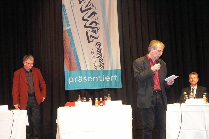 Zugegeben, es war keine einfache Veranstaltung für die beiden 'Staatsanwälte' der NWZ, Daniel Grupp und Reinhard Krötz, aus der Bewerberin und den Bewerbern für den Eislinger Rathausstuhl die differenzierenden Antworten herauszulocken. Und so wurden erwartungsgemäß die meisten Fragerunden mit Gleichstand bei den vier Teilnehmern beantwortet. Wen wundert es, denn bei Kinder und Jugend, Sozialem, Stadtentwicklung und ähnlichen Themen gibt es Sachzwänge um die keiner der Diskussionsteilnehmer herumkommt und hier sich auch keine fachliche Blöße geben wollte.