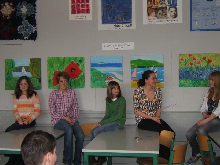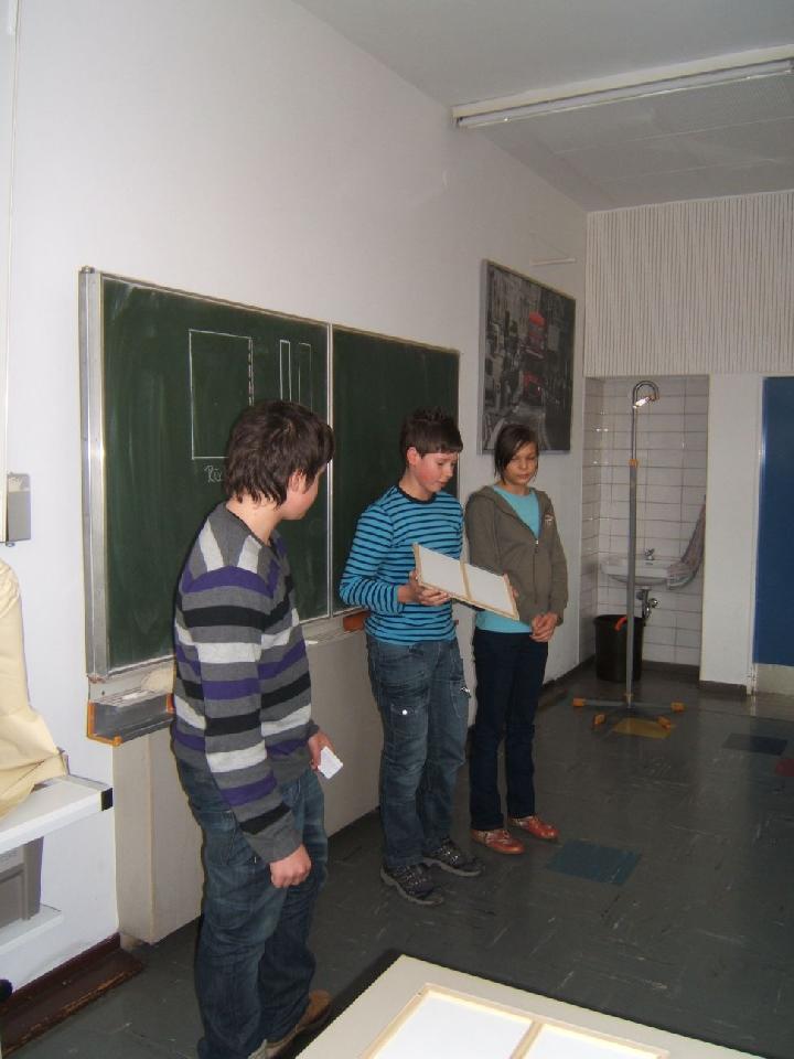 Die Klasse 8d der Dr.-Engel-Realschule arbeitet derzeitig an ihrem WVR - Projekt (Wirtschaften – Verwalten – Recht). Die Schülerinnen und Schüler wollen den Bewohnern des „Haus am Kronenplatz“ helfen. In diesem Pflegeheim sind viele Demenzerkrankte untergebracht. Die Klasse unterstützt nun mit ihrer Arbeit das Zusammenwohnen der Menschen dort, sowie die Arbeit des Personals, indem sie im Technikunterricht Orientierungshilfen herstellt, mit denen sich die Bewohner besser zurechtfinden und leichter ihr Zimmer finden sollen. Dazu haben die Schülerinnen und Schüler Wechselrahmen gefertigt, in die dann im Anschluss Bilder geschoben werden, mit denen die Demenzkranke etwas verbinden, so dass diese Rahmen bei der Suche des eigenen Zimmers als Orientierung dienen. Außerdem wurden im Kunstunterricht Bilder gemalt, die die einzelnen Zimmer etwas freundlicher und gemütlicher machen. Bei diesem Projekt werden die Jugendlichen von Frau Schmid (neu mit dabei: Herr Steiner), Herrn Bartenbach und Herrn Schöller vom Stadtseniorenrat Eislingen unterstützt. So wurden gemeinsam die verschiedenen Ideen besprochen und Materialabsprachen sowie Preisvergleiche in den Baumärkten durchgeführt. Bei der Präsentation |
