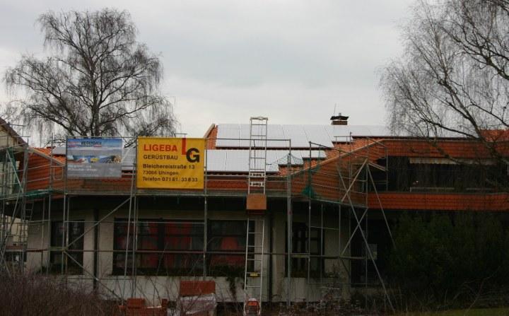 Das Gerüst um das Gemeindehaus der Christuskirchengemeinde steht zwar noch, doch die Pho-tovoltaikanlage, die in den letzen Tagen installiert wurde, erzeugt bereits Strom!